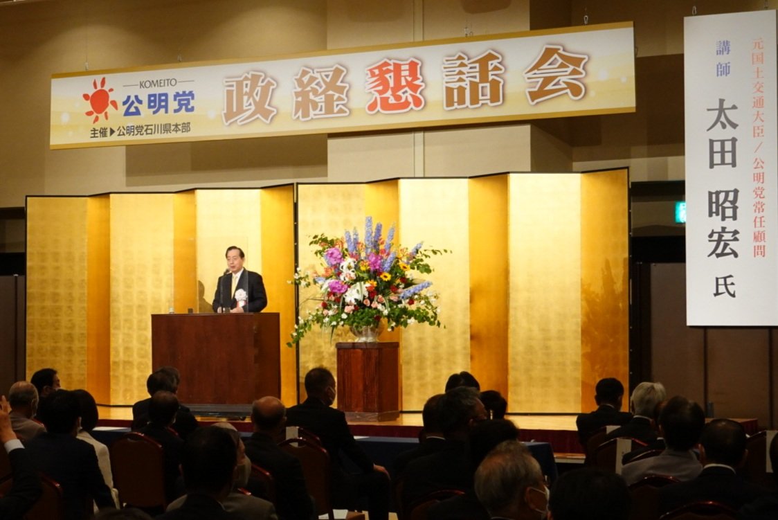 22日、石川県で公明党政経懇話会が盛大に行われました。これには上田勇参院選予定候補をはじめとする公明党国会議員、岡田直樹参院議員など自民党国会議員、馳浩知事、県会・ 市会・町村会議員、各市町村長、経済界、各種団体代表らが多数参加。久しぶりの盛大な会となり、参院選勝利へ力強いスタートができました。私は講演を行いました。とくに上田勇さんは、内外の激動のなか、「必ずこの国難ともいうべき状況を脱するために全力で戦う」と熱く決意を披瀝。私は、上田勇さんと共に戦ってきた状況、外交にも経済にも圧倒的に強い、苦労もしていることを報告。「ロシアのウクライナ侵略は世界の枠組みを大きく変える暴挙だ。また日本の『長期にわたる緩やかなデフレ』は何としても脱却しなくてはならない。今こそ力ある政治家が大事だ。安全・安心の勢いのある国をつくるために今こそ立ち上がらなければならない」と、公明党、自公連立政権への力強い支援を訴えました。
