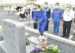 献花式では、参列者全員で黙とうした後、地元自治会長の村岡平吉さんがあいさつ。「災害はいつどこで起こるか分からない。自分の命は自分で守り、人と人との絆をこれまで以上に深めて、未来へ語り伝えていきたい」と述べた。