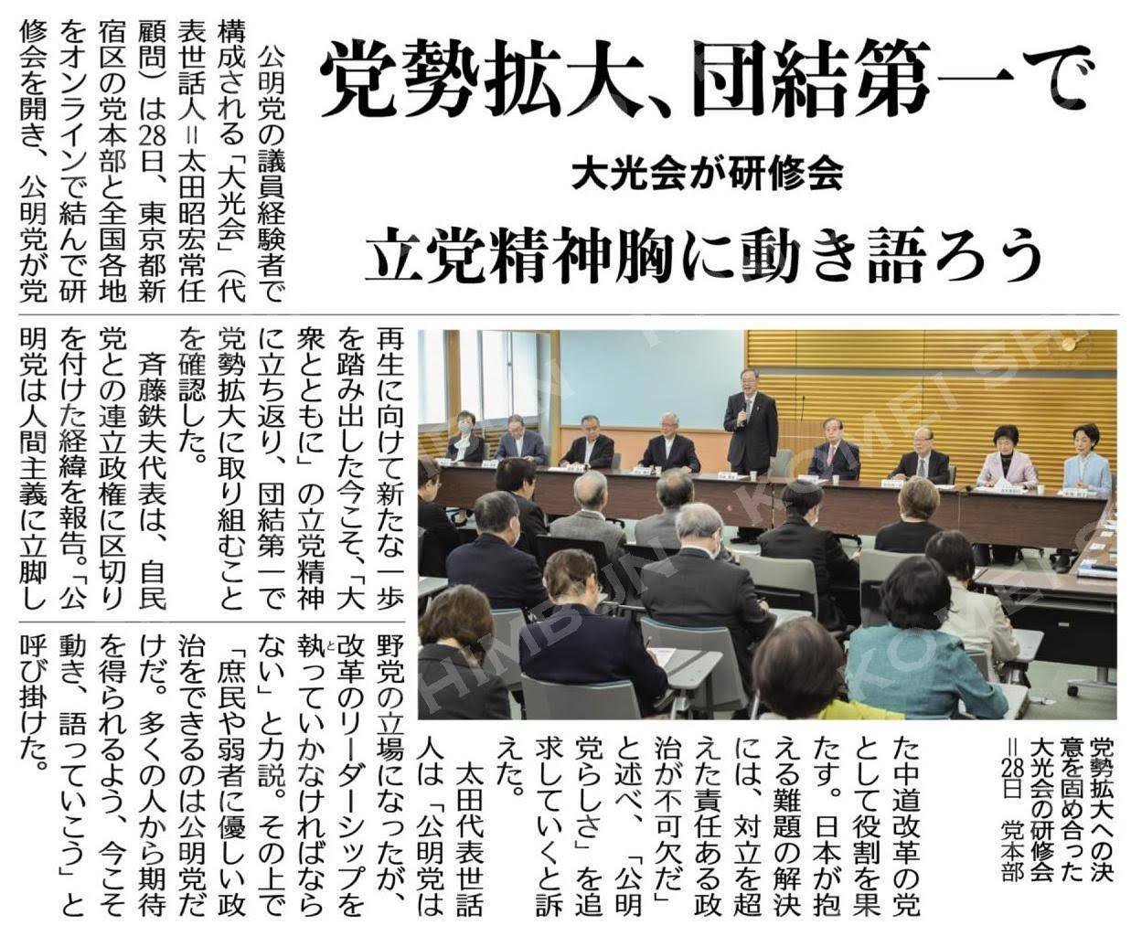 公明党の議員経験者で構成される「大光会」(代表世話人=太田昭宏常任顧問)は28日、東京都新宿区の党本部と全国各地をオンラインで結んで研修会を開き、公明党が党再生に向けて新たな一歩を踏み出した今こそ、「大衆とともに」の立党精神に立ち返り、団結第一で党勢拡大に取り組むことを確認した。