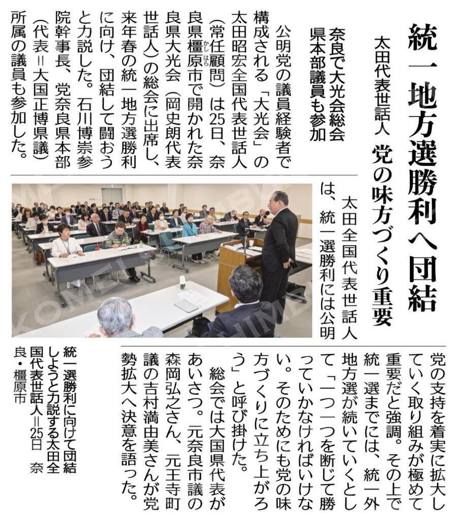 公明党の議員経験者で構成される「大光会」の太田昭宏全国代表世話人(常任顧問)は25日、奈良県橿原市で開かれた奈良県大光会(岡史朗代表世話人)の総会に出席し、来年春の統一地方選勝利に向け、団結して闘おうと力説した。石川博崇参院幹事長、党奈良県本部(代表=大国正博県議)所属の議員も参加した。