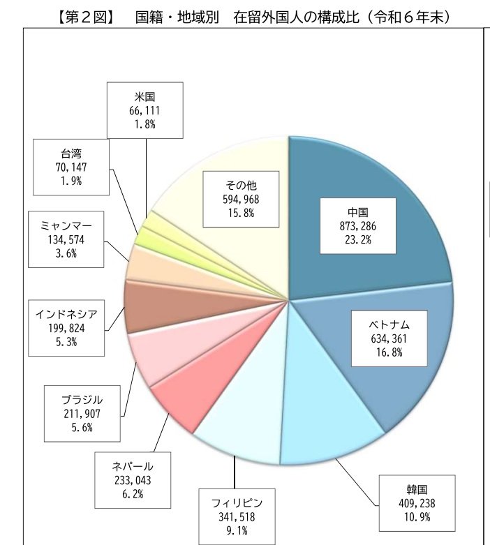 在留外国人は2024年末現在376.8万人(特別永住者27.4万人を含む)となっている。国籍・地域別では中国87.3万人、ベトナム63.4万人、韓国40.9万人、フィリピン34.1万人、ネパール23.3万人、ブラジル21.1万人、インドネシア19.9万人、ミャンマー13.4万人、台湾7.0万人、米国6. 6万人となっている。在留資格別に見ると、①永住者(永住許可者)91.8万人②技能実習45.6万人③技術・人文知識・国際業務(大学卒で来日、働いている人)が41.8万人④留学生40.2万人、⑤家族滞在(③の家族) 30.5万人⑥特定技能28.4万人⑦定住者22.3万人⑧日本人の配偶者等15万人――などとなっている。