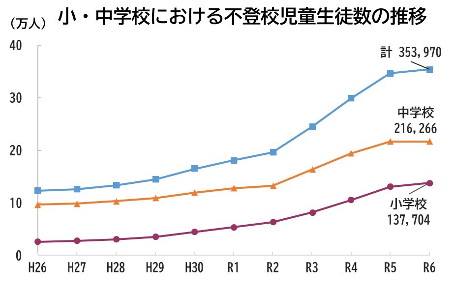 2024年度の小中学生の不登校は35万3970人で過去最多となった。内訳は小学生13万7700人(前年度比5.6%増)、中学生は21万6266人(同0.1%増)となっており、小中学生全体の3.9%を占めている。クラスで1人いることになり、憂慮すべき事態と言える。12年連続の増加で、この10年で急増、コロナ禍もあって、5年前から2倍近くなっている。ただ2024年度で注目すべきは、急増の度合が減ったというデータとなっている点だ。 2022年度が前年度比22.1%増、2023年度が15.9%増であったのが、2024年度は2.2%となり、前年度から低下した。新規不登校児童生徒数も不登校継続率も前年度から低下している。国が進めてきた「相談体制の拡充」「居場所づくり」など防止の取り組みが奏功していると見るならば、その対策の手の更なる拡充・強化が求められる。